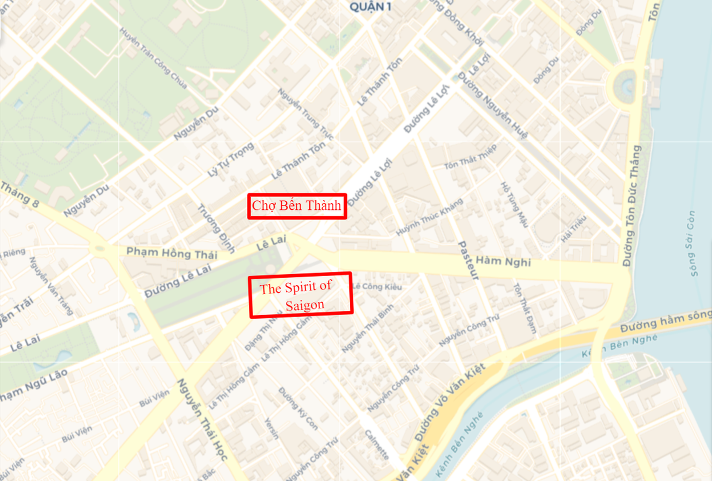 Vị trí dự án The Spirit of Saigon nơi trung tâm quận 1, đối diện chợ Bến Thành (Ảnh: Cốc Cốc).