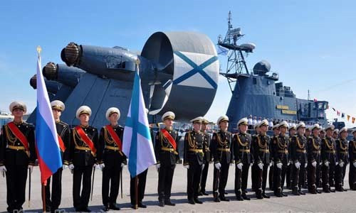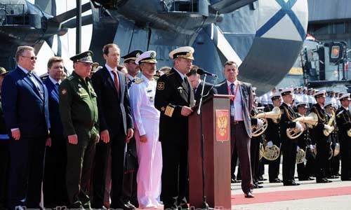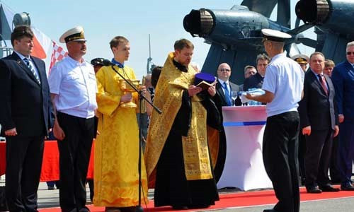 Buổi lễ được tổ chức trang nghiêm, hoành tráng với sự tham gia của nhiều quan chức Hải quân Nga và quốc tế.