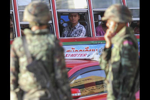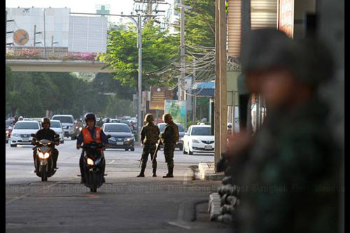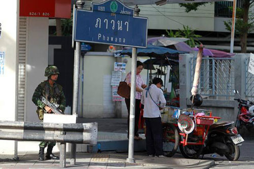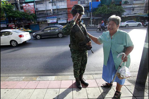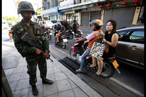 Binh lính Thái Lan có vũ trang được triển khai trên các trục đường chính tại thủ đô Bangkok vào hôm nay (25/5). Thái Lan trong ngày đầu thiết quân luật mang hình ảnh khá căng thẳng.