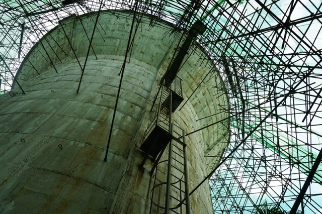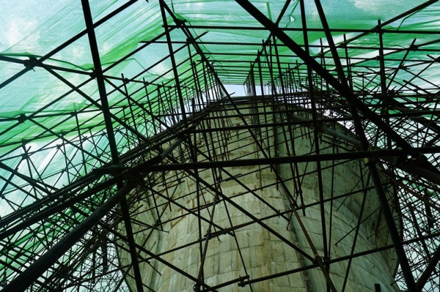 Xung quanh thủy đài có dàn giáo dày, kết nối với những móc sắt nhằm đảm bảo an toàn trong quá trình tháo dỡ.