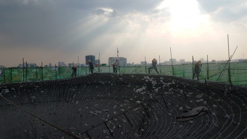 Gần 1 tháng chuẩn bị dàn giáo, bọc lưới xung quanh thủy đài, các công nhân đã bắt đầu tháo dỡ thủy đài cao hơn 30m này.