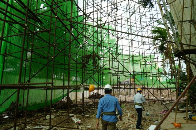 Sau 3 ngày thi công, phần nắm và mái thủy đài đã bị phá bỏ. Hiện ra trước mắt là những khung sắt có kết cấu khá chắc, đồng bộ.