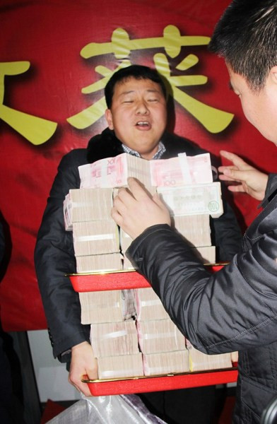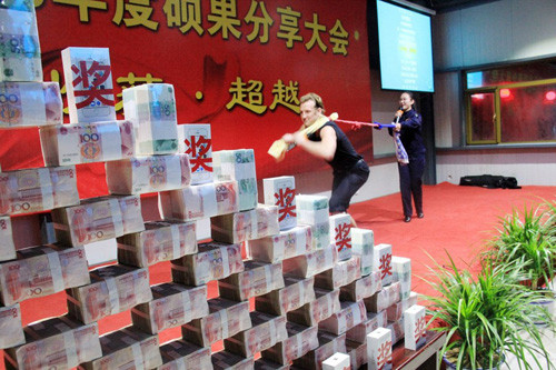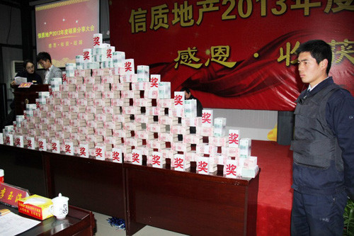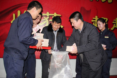 Bữa tiệc chia thưởng diễn ra hôm 21/1 ở huyện Chá Thành, tỉnh Hà Nam, miền trung Trung Quốc. Tổng số tiền thưởng lên đến 11 triệu nhân dân tệ (1,8 triệu USD) có nhân viên được thưởng đến gần 2 triệu tệ (330.000 USD).