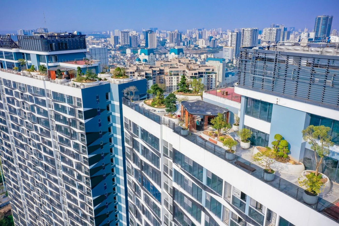 Khu vườn Nhật trên mái tầng 43 của 2 tòa tháp đã hoàn thiện 99%. Ghế ngồi, bồn cây bonsai, đá ốp lát, chòi Pavilon… đã hiện hữu. Đây là không gian lý tưởng để ngắm hoàng h ôn, giúp các chủ nhân tương lai tận hưởng được cảm giác thư giãn cùng thiên nhiên giữa chốn bồng lai ở lưng chừng trời.