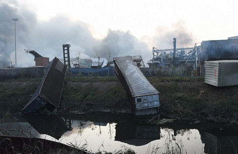 Các công-ten-nơ nằm ngôn ngang tại hiện trường