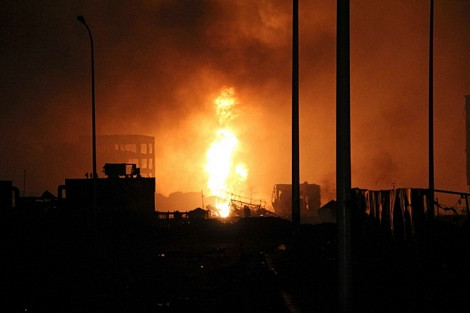 Ngọn lửa sáng rực trong đêm sau vụ nổ tại một nhà kho chứa hàng hóa nguy hiểm ở khu vực Binhai New Area của thành phố Thiên Tân.