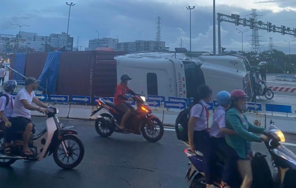 Qua đoạn video cho thấy, hai xe container di chuyển từ hướng cầu Tuyên Sơn rẽ phải đường Ngô Quyền hướng về cảng Tiên Sa thì một chiếc xe bị lật do ôm cua gấp, chở hàng nặng.