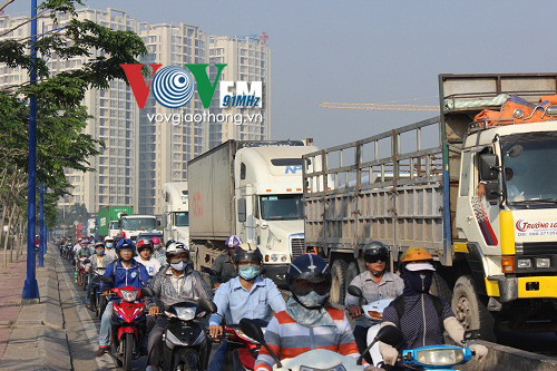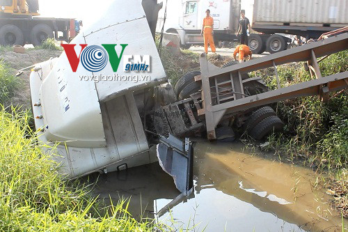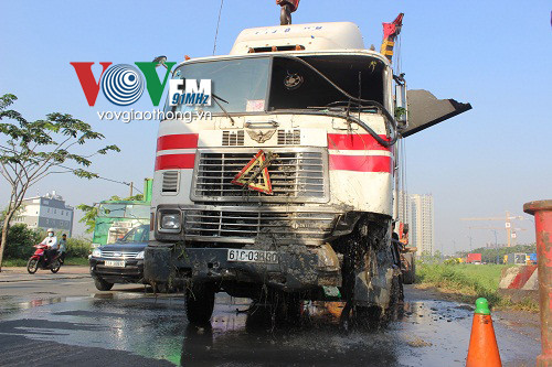Khoảng 3h30 rạng sáng nay (12/11), xe đầu kéo mang BKS: 61C - 038.30 kéo theo rơ moóc BKS: 61R - 001.40, lưu thông trên đường Đồng Văn Cống hướng từ xa lộ Hà Nội vào cảng Cát Lái.