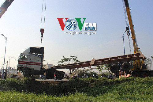Tổ xử lý tai nạn quận 2 cùng lực lượng CSGT đội Cát Lái có mặt sau đó, tiến hành giải quyết và điều tiết giao thông. Hai xe cứu hộ loại lớn được huy động để kéo chiếc xe gặp nạn lên.