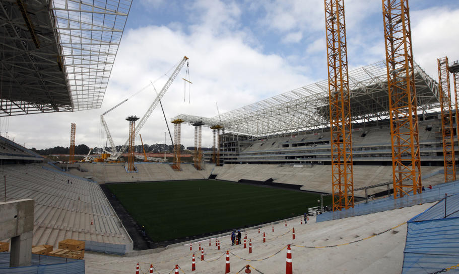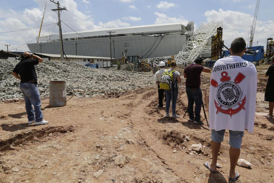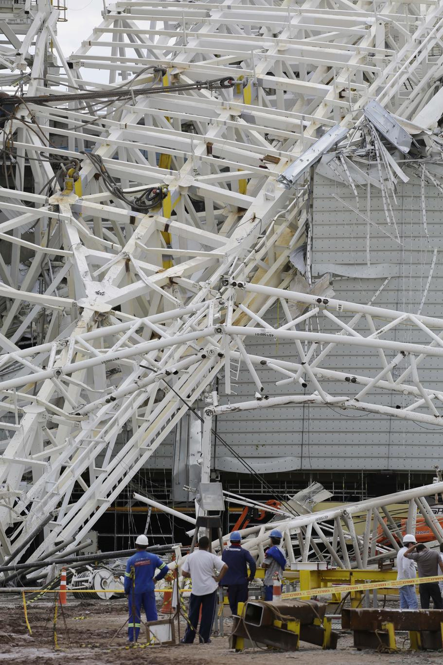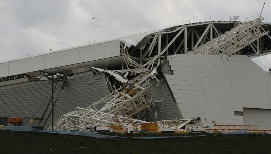 Khi đang thi công tại sân vận động Arena Corinthians-nơi sẽ diễn ra trận khai mạc World Cup 2014, chiếc cần cẩu khổng lồ bất ngờ đổ xuống, làm sập mái và khán đài sân, khiến hai công nhân tử vong.