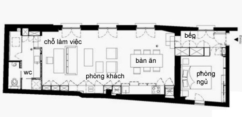 Chỗ tiếp khách đơn giản với nhiều kiểu ghế. Bàn trà nhỏ không tốn diện tích.