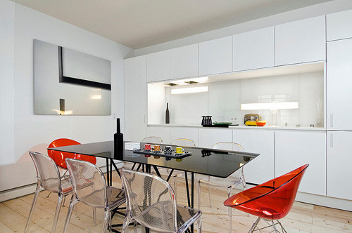 Bộ bàn ăn hiện đại với những chiếc ghế trong suốt hoặc dạng lưới có thiết kế đơn giản. Hệ tủ kệ trắng thanh lịch được làm sát tường có thể chứa rất nhiều đồ.