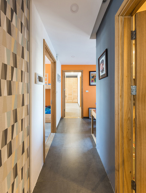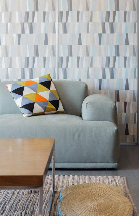 Họa tiết và màu sắc của lớp vách cũng được thiết kế phù hợp với không gian chung. Dù khi xếp gọn hay mở ra, đó đều là những mảng nhấn ấn tượng cho căn hộ với các tông màu trắng, xám trung tính. Lớp hoàn thiện mặt vách cũng có thể thay đổi sang các vật liệu khác dễ dàng, giúp thay đổi điểm nhấn khi chủ nhà muốn có sự mới lạ.