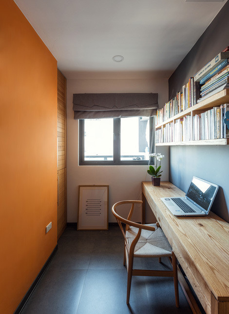 Khi vách xếp gọn, không gian sinh hoạt chung nhận ánh sáng từ hai cửa sổ lớn. Kiến trúc sư lựa chọn màu trầm cho một số mảng tường để không gian không bị quá chói sáng vào ban ngày.