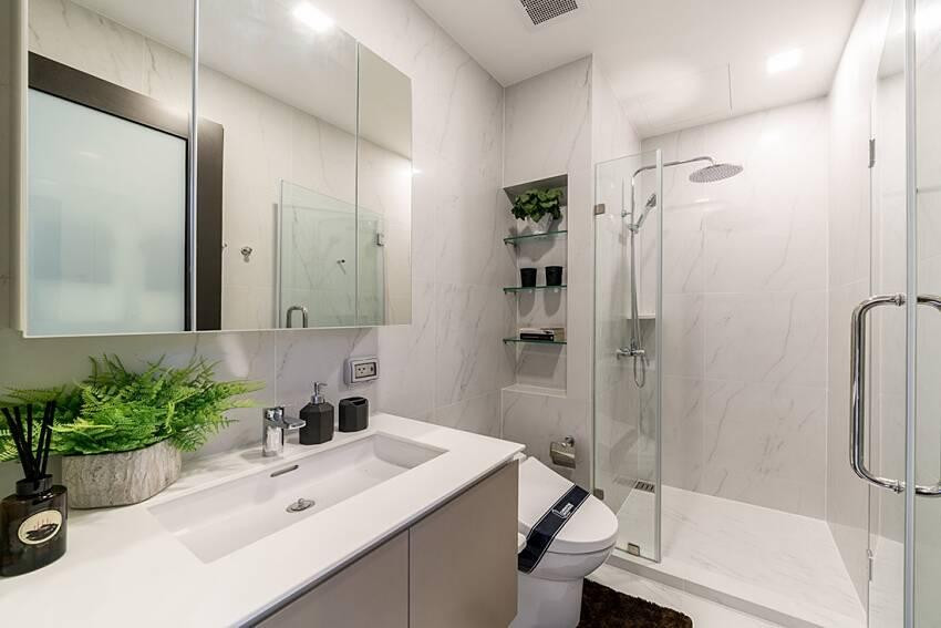 | Phòng vệ sinh hẹp nằm bên cạnh cầu thang dẫn lên gác lửng, được ốp gạch toàn bộ sàn và trần để hạn chế tình trạng thấm nước và nấm mốc. |