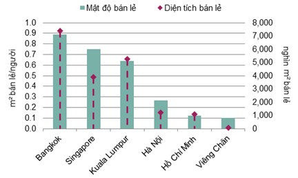 Với 0,10 m² bán lẻ/người, mật độ bán lẻ ở Viêng Chăn còn thấp so với các thành phố trong khu vực, thể hiện tiềm năng phát triển của thị trường này trong tương lai.
