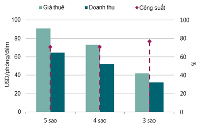 Cụ thể, giá thuê phòng trung bình của phân khúc 3 đến 5 sao đạt USD63/phòng/đêm; công suất trung bình đạt 74%; doanh thu phòng trung bình đạt USD47/phòng/đêm. Nguồn cung lớn làm gia tăng cạnh tranh và giảm giá thuê phòng so với các năm trước. Công suất khách sạn tại Viêng Chăn cao hơn các tỉnh khác do Viêng Chăn là cửa ngõ du lịch của cả nước.
