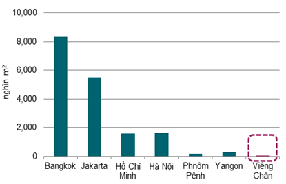 So với các thành phố Đông Nam Á khác thì thị trường văn phòng Viêng Chăn còn khá nhỏ: chỉ bằng 0,6% của Bangkok, 1% của Jakarta, 3% của Hà Nội và Hồ Chí Minh, 17% của Yangon và 28% của Phnôm Pênh.