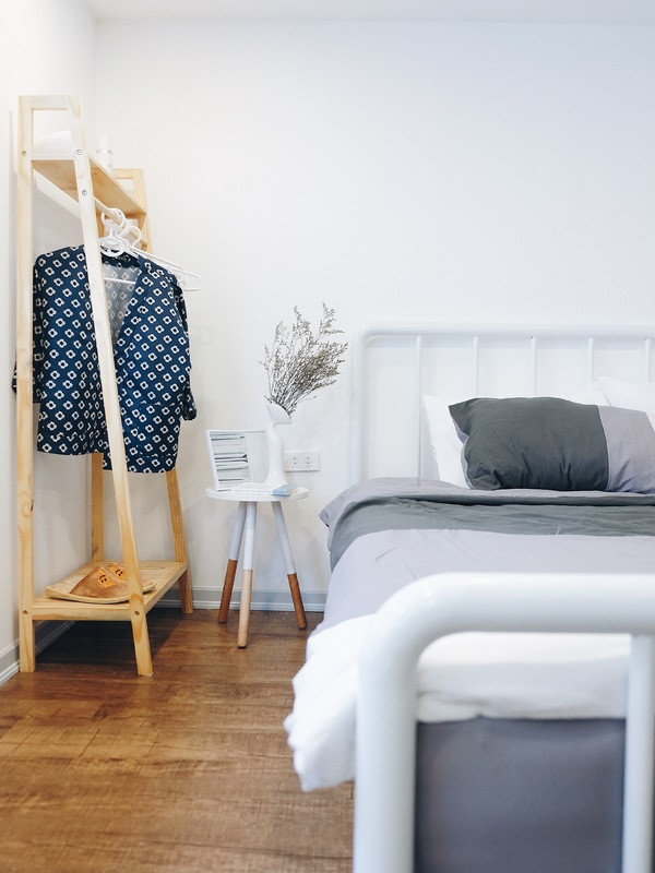 Móc treo quần áo bằng gỗ mộc mạc, kết hợp với chiếc bàn nhỏ xinh đầu giường.