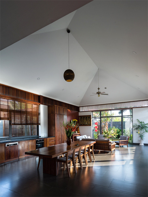 Màu gỗ nâu của nội thất đem lại cảm giác ấm áp, thân quen cho ngôi nhà. Kiến trúc sư tận dụng tối đa thông gió tự nhiên cho nhà bằng hệ vách gỗ chạy sát trần.