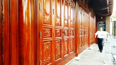 Hành lang ngoài căn nhà được thưng bằng gỗ đinh hương chạm trổ tinh xảo và nổi bật.