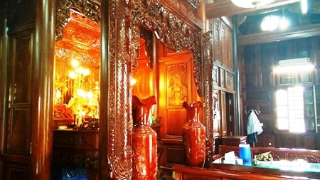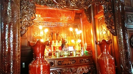 Gian thờ trong căn nhà được chạm khắc tinh xảo, sang trọng và bài trí bắt mắt. Chủ nhân cho biết, hàng chục thợ mộc khéo tay ở địa phương và từ các tỉnh Thừa Thiên Huế, Nam Định, Ninh Bình đã được thuê để thi công căn nhà này.