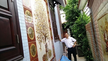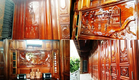 Trong căn nhà, các thợ mộc khéo tay đã chạm trổ những bức tranh lưu niệm về gia đình. Ngoài ra còn là những bức tuyệt đẹp về di tích lịch sử của đất nước như Văn Miếu…
