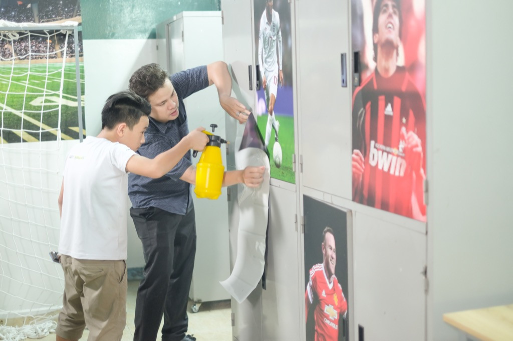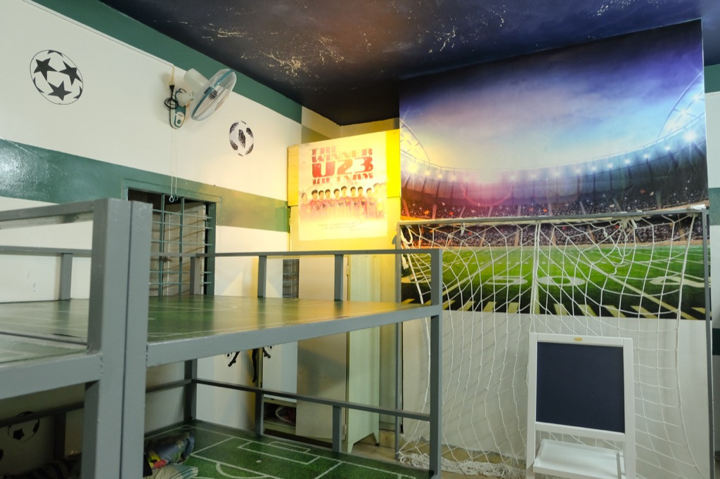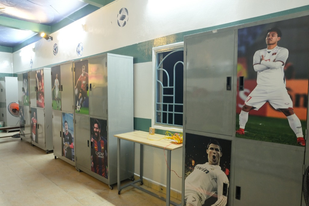 Theo đó, các giường ngủ đã được thiết kế lại gọn gàng và trang trí theo chủ đề sân bóng ấn tượng. Trên các tủ đồ còn là loạt poster của các ngôi sao bóng đá nổi tiếng của thế giới cũng như Việt Nam. Và vấn đề làm mát cũng được giải quyết hợp lí, loạt quạt mới được lắp đặt và ống thông gió được bổ sung khiến căn phòng mát mẻ thoáng đãng hơn nhiều.