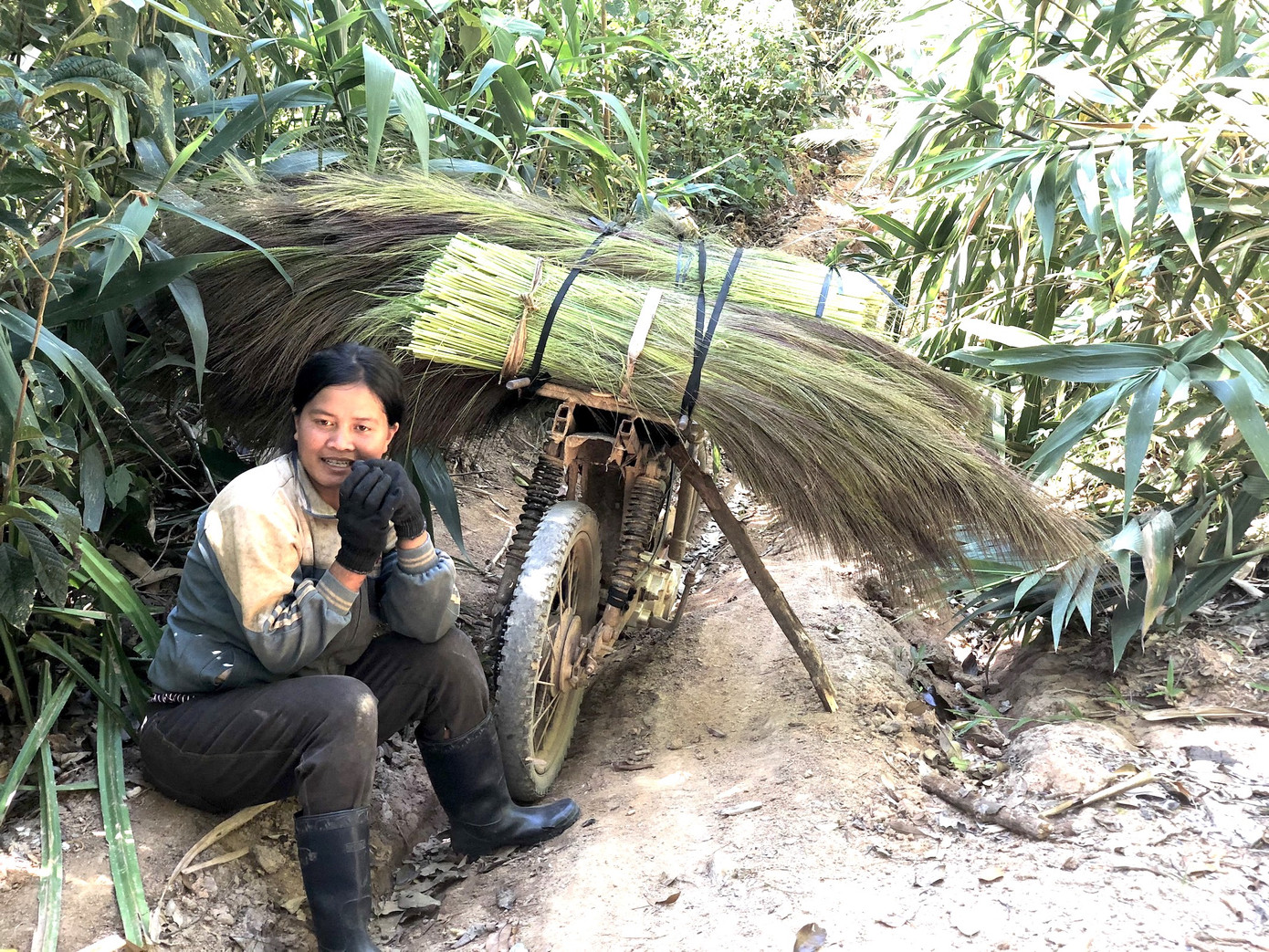 Chị Hyeh (dân tộc Ba Na, 26 tuổi, xã H'ra) nghỉ ngơi sau những giờ vất vả tìm bông đót. Theo kinh nghiệm của chị Hyeh, đót trổ bông trong 2 tháng đầu năm nhưng chỉ thu hoạch được trong khoảng 30 ngày, vì nếu hái chậm kịp bông sẽ già và thương lái không thu mua