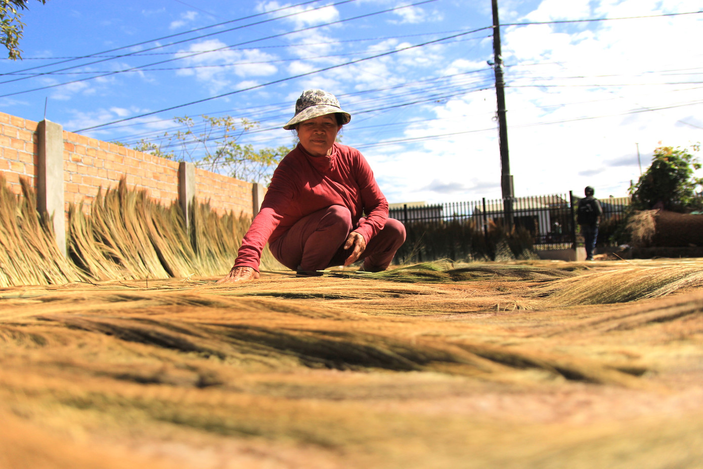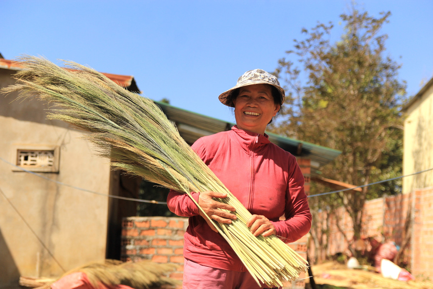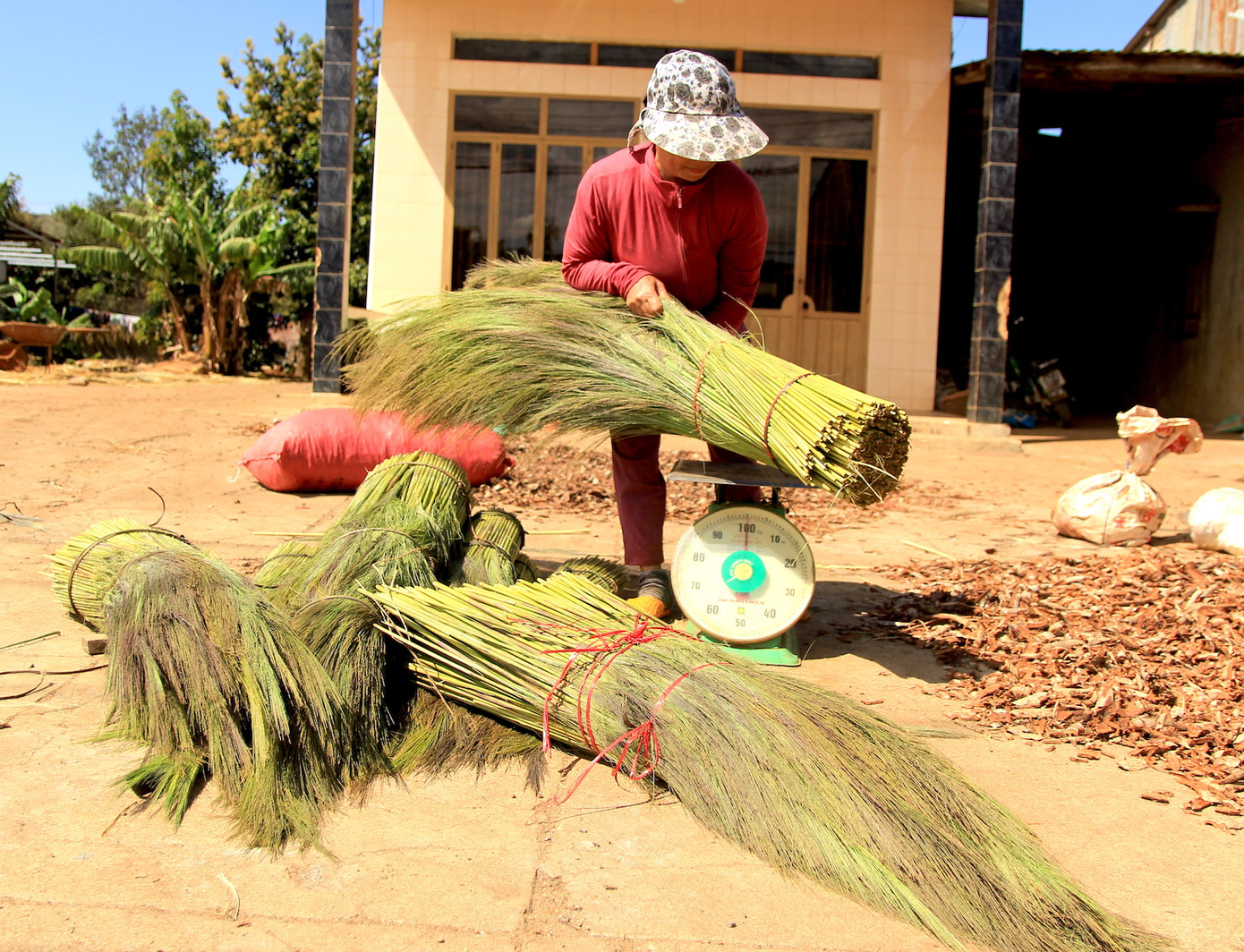 Giữa trưa, bà Phạm Thị Hồng (60 tuổi, xã Hoà Phú, huyện Chư Păh, Gia Lai) tranh thủ thu mua những bó đót tươi với giá khoảng 7 nghìn đồng/1 kg