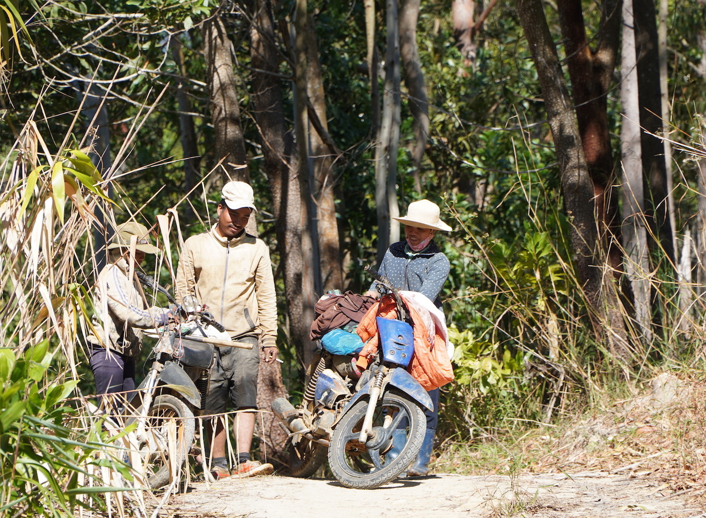 Để đến được vùng có nhiều đót, anh Kling (ở giữa, 35 tuổi, xã H'ra, huyện Mang Yang) và bạn là anh Kim đi xe máy từ 5h sáng đến ngọn núi cách nhà khoảng 10km