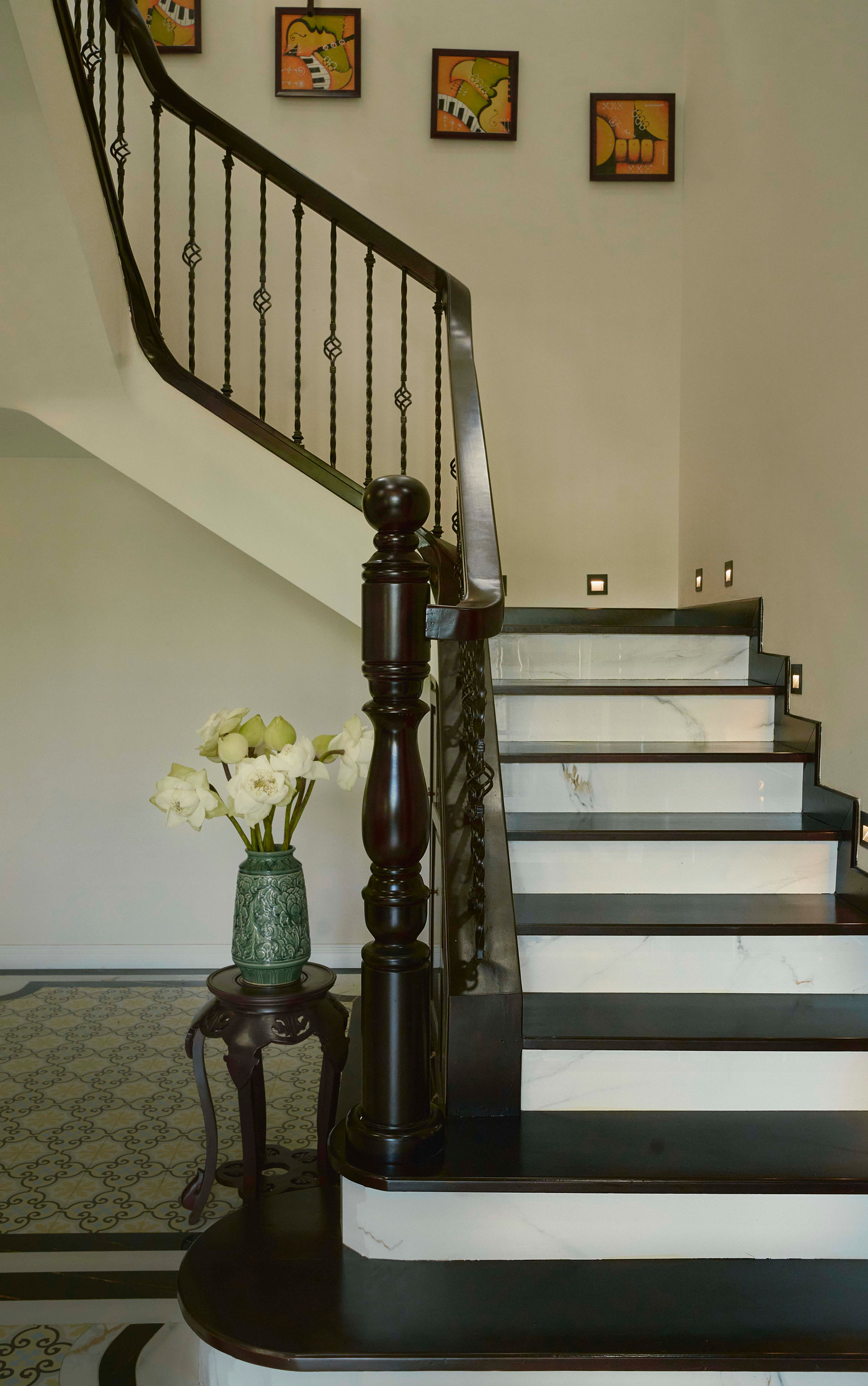 | Gạch bông, cầu thang và hoa văn được lồng ghép hiệu quả để tạo nên không gian Indochine. |