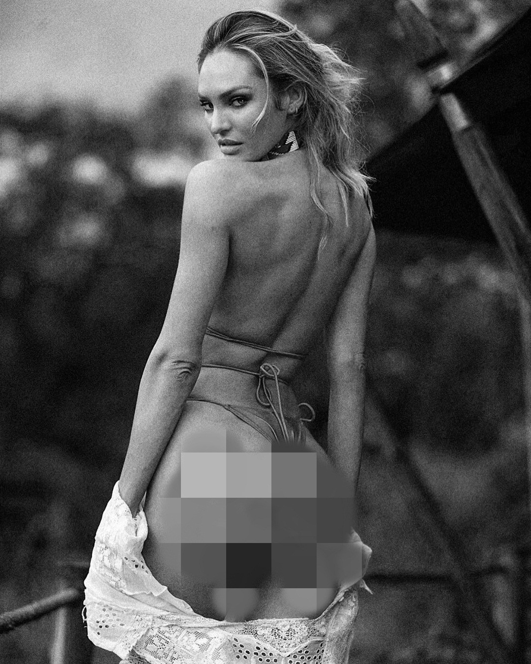 Bức ảnh đen trắng Candice Swanepoel quảng cáo áo tắm do chính cô thiết kế TropicofC phô diễn trọn vẹn đường cong bốc lửa của cô.