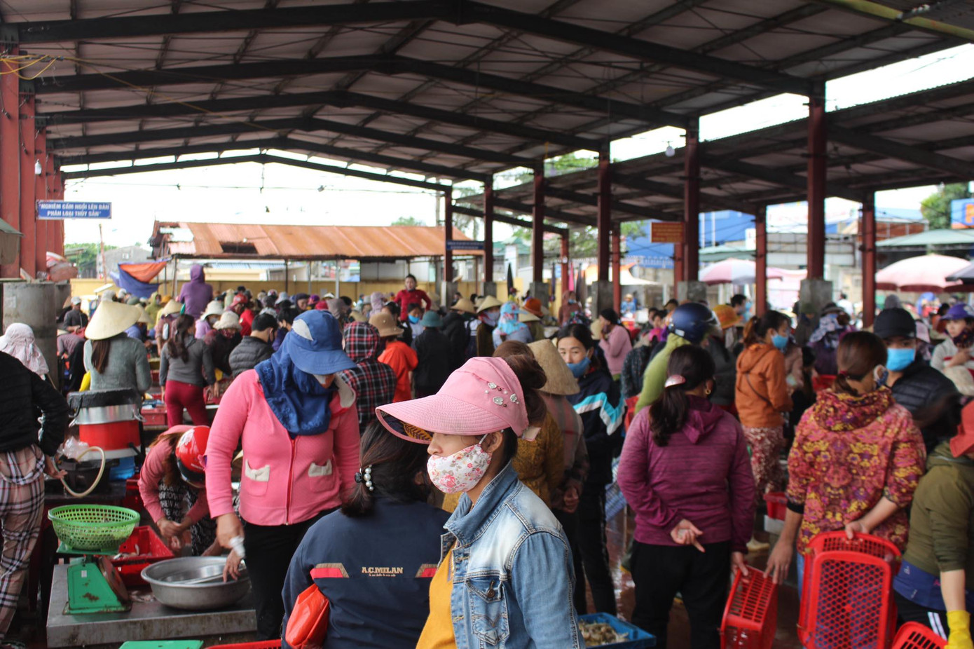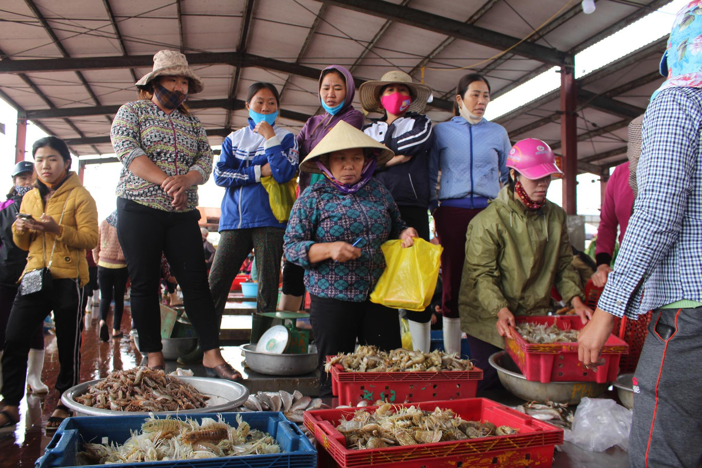 Hàng trăm người chen chúc nhau tại cảng cá Lạch Vạn. Việc giãn cách xã hội ở đây dường như cũng là điều không thể thực hiện.