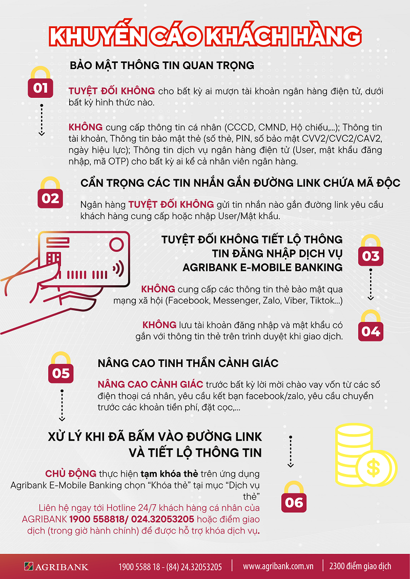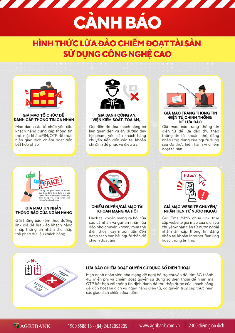 Trước tình hình lừa đảo chiếm đoạt tài sản sử dụng công nghệ cao có nhiều diễn biến phức tạp, Agribank gửi thông tin cảnh báo giúp khách hàng nhận biết nhanh các hình thức lừa đảo phổ biến hiện nay và nâng cao cảnh giác, xây dựng phòng tuyến bảo mật trước các chiêu trò tinh vi.
