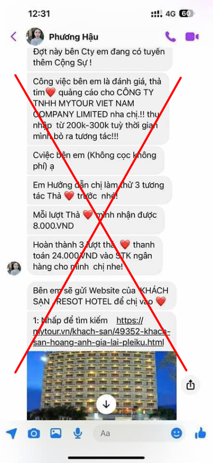 Đây là chiêu trò quen thuộc nhất mà các đối tượng lừa đảo thường sử dụng trên các sàn thương mại điện tử. Nội dung mà các đối tượng thường mời gọi là “công ty TNHH Mytour Việt Nam tuyển cộng tác viên bán hàng để tăng lượng đơn hàng”, “nhận đánh giá tốt trên website Mytour.vn cho các khách sạn, resort”...
