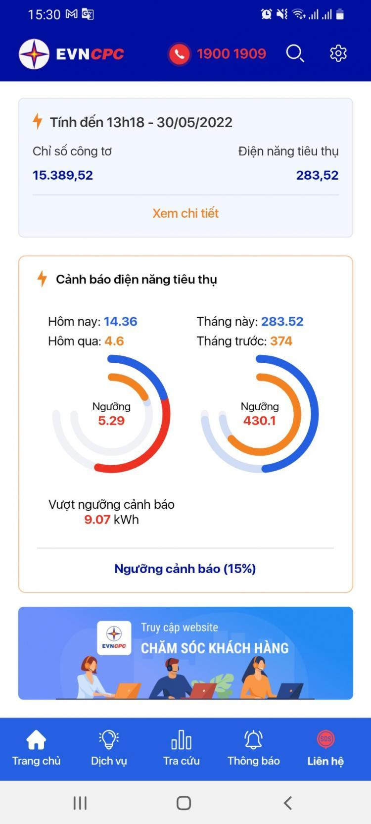 Bên cạnh việc chủ động điều chỉnh thói quen sử dụng điện, khách hàng cần thường xuyên theo dõi sản lượng điện tiêu thụ hằng ngày của gia đình. Hiện nay ứng dụng “EVNCPC CSKH” đã được nâng cấp nhiều tính năng mới mẻ phục vụ khách hàng, trong đó, chức năng cảnh điện năng tiêu thụ được thể hiện rất trực quan, có số liệu cụ thể và so sánh với thời điểm tháng trước để kịp thời cảnh báo khách hàng khi sản lượng tiêu thụ vượt ngưỡng do khách hàng thiết lập. Khách hàng tải và cài đặt ứng dụng tại đây với các phiên bản Android và iOs.