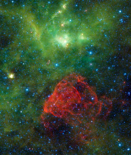 Tàn dư của vụ nổ siêu tân tinh Puppis A trông giống như một bông hồng màu đỏ tuyệt đẹp trong vũ trụ. Hình ảnh do kính thiên văn vũ trụ WISE của Cơ quan vũ trụ Mỹ (NASA) ghi lại.