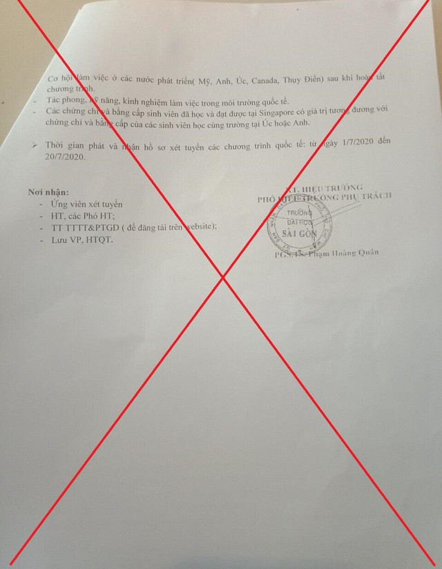 Tuy nhiên, để nhận phân biệt thật giả này thì không khó bởi văn bản không có ngày, tháng, năm; ở phần chữ ký và đóng dấu lại ghi PGS.TS Phạm Hoàng Quân là là Phó Hiệu trưởng phụ trách Trường Đại học Sài Gòn (thực tế ông Quân là Hiệu trưởng nhà trường từ năm 2016 đến nay-PV).