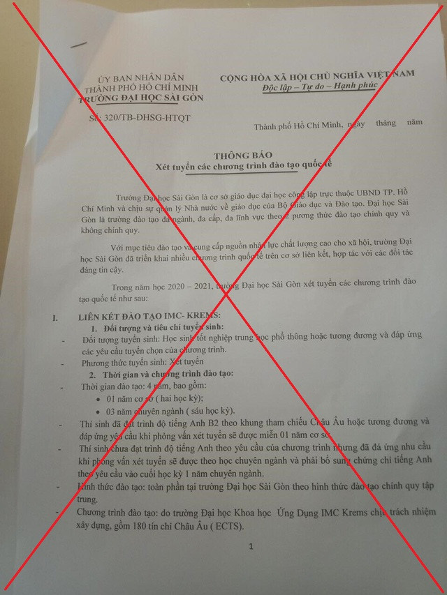 Qua kiểm tra, trung tâm này phát hiện có một văn bản giả mạo thông báo tuyển sinh các chương trình đào tạo quốc tế theo phương thức xét tuyển. Nội dung giả mạo gồm 2 nội dung là chương trình liên kết đào tạo IMC - KREM, đào tạo trong 4 năm. Đối tượng tuyển sinh là học sinh tốt nghiệp trung học phổ thông hoặc tương đương và đáp ứng các yêu cầu tuyển chọn của chương trình.