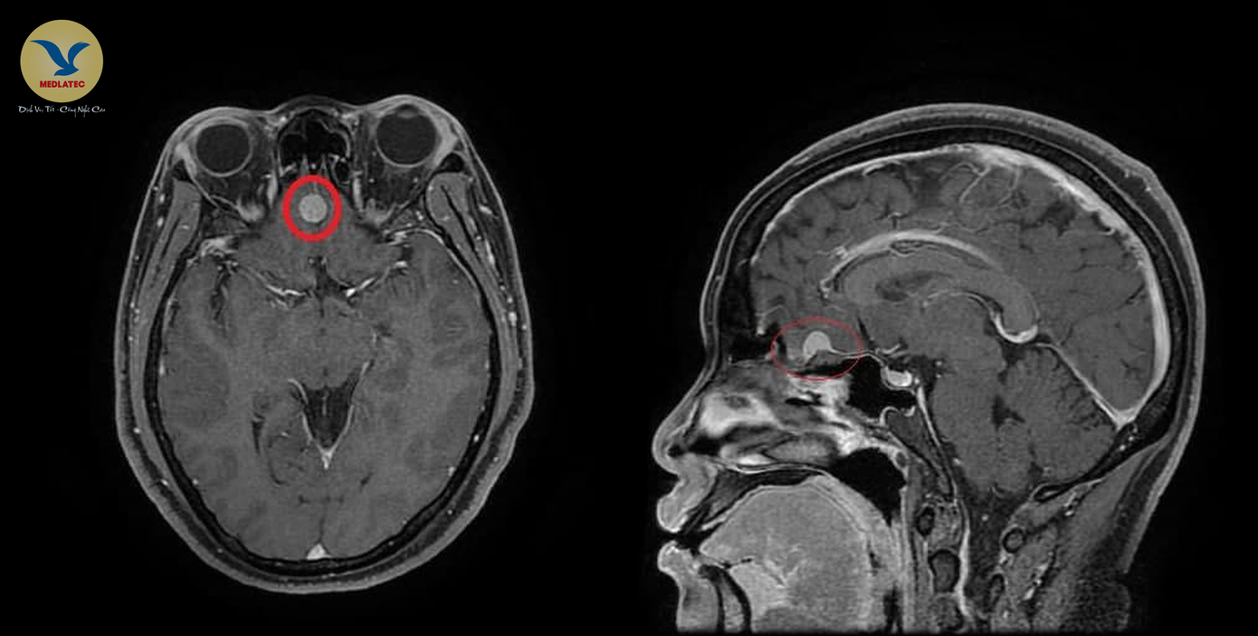 Qua quá trình thăm khám lâm sàng, chị T., không có triệu chứng bất thường điển hình, mà nổi bật là đau đầu, đau nhiều vùng đỉnh chẩm, đau lan ra sau gáy, thạc sĩ Chi chỉ định bệnh nhân chụp cộng hưởng từ (MRI) và phát phát hiện khối u màng não kích thước khoảng 9x10mm vị trí liềm đại não trước.