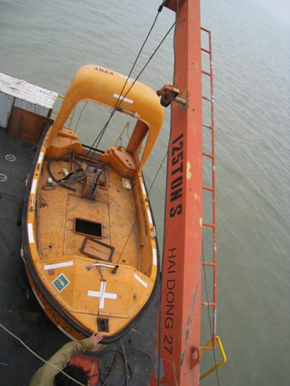 Gần đó, một chiếc ca nô dùng cho việc di chuyển ngắn, tiếp tế và cứu hộ chưa kịp hạ thủy khi tàu Hai Dong 27 gặp nạn.