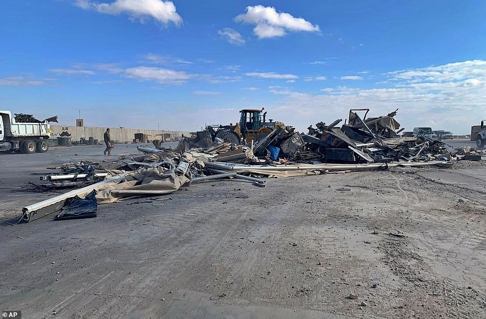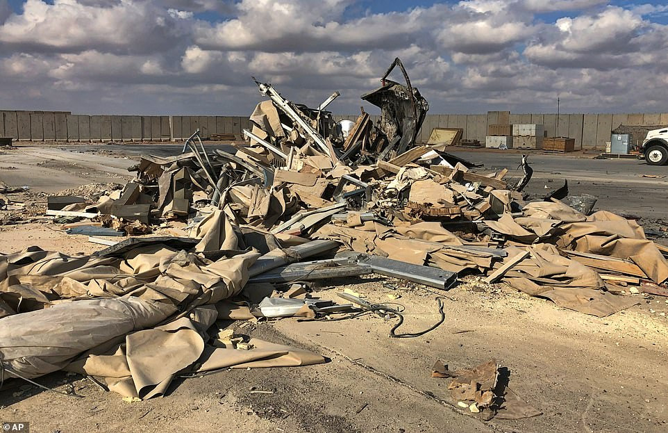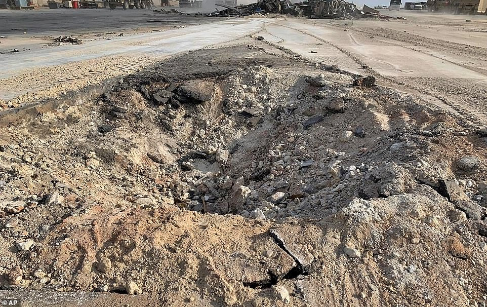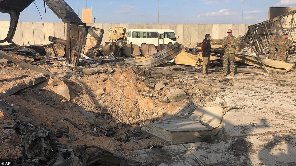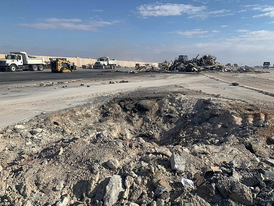 Cuộc tấn công tuần trước của Iran nhằm vào căn cứ Ain al-Asad đã để lại những miệng hố khổng lồ trên mặt đất, và làm hỏng nhiều phương tiện quân sự. Ảnh: AP