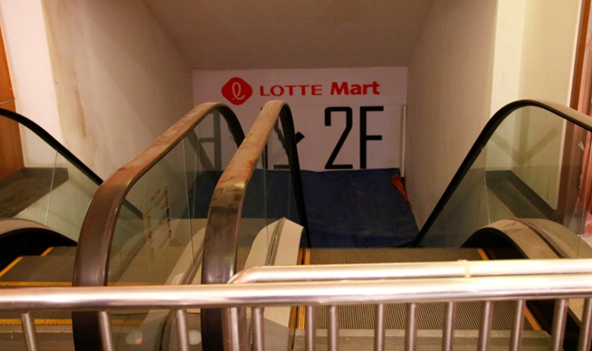 | Các cầu thang cuốn đều ngừng hoạt động, dựng rào chắn ngăn không cho khách hàng đi xuống các tầng dưới. |