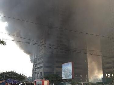 Ngọn lửa bùng lên rất nhanh, khói cuộn ngùn ngụt, bao trọn cả tòa nhà đang thi công. Hàng loạt công nhân trong tòa nhà hoảng loạn tháo chạy.