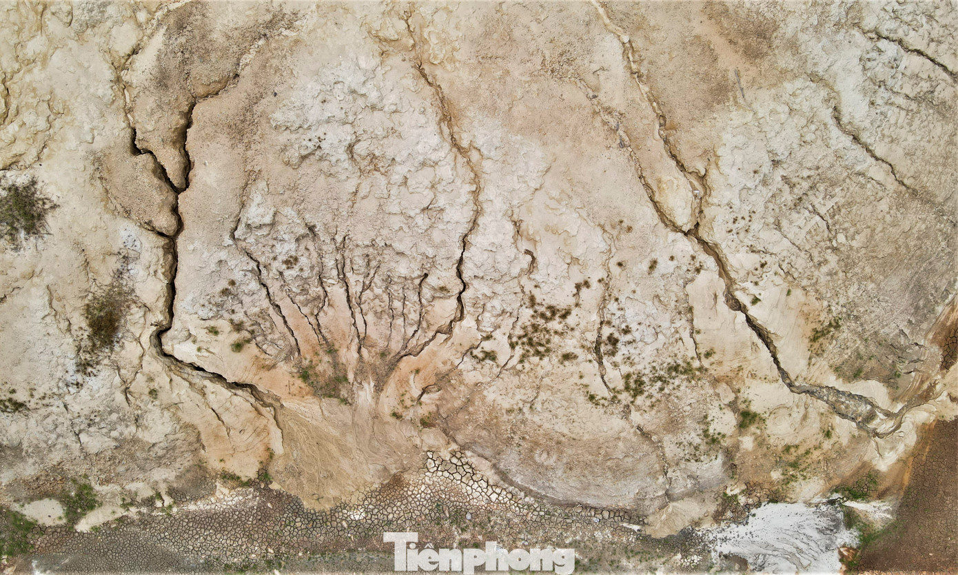 Nhìn từ trên cao, lòng hồ xuất hiện những vũng bùn như hố bom. Người dân cho biết đó là những vũng bùn do đàn cá làm tổ hình thành nên.