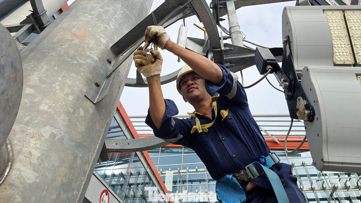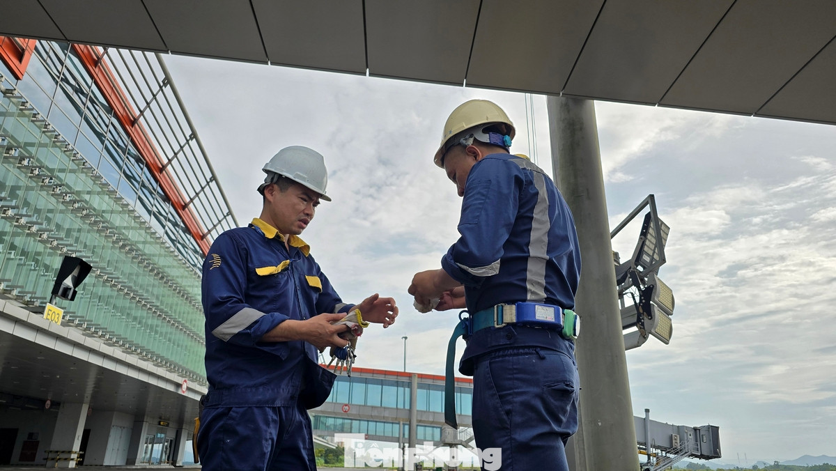 Đội ngũ kỹ thuật của sân bay Vân Đồn đang cho hạ toàn bộ hệ thống đèn chiếu sáng trên cao ngoài sân đỗ đồng thời cố định lại bằng dây thép.