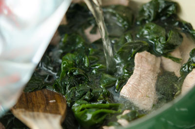 - Đảo nhẹ tay ở lửa vừa khoảng 3 phút thì bạn cho 6 bát con nước lọc vào, đun sôi.