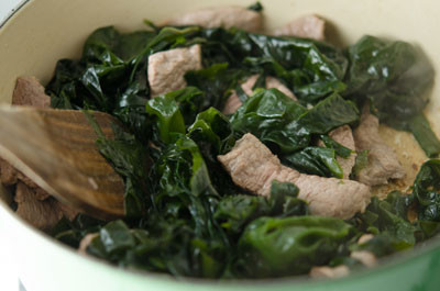 - Xào thịt bò khoảng 2 phút thì cho tiếp lá rong biển vào đảo cùng.
