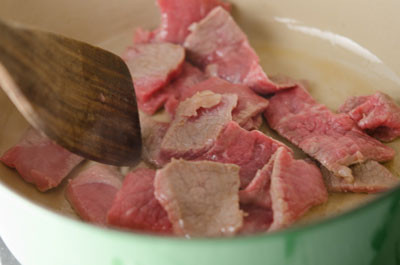- Cho 1 thìa canh dầu vừng vào nồi, đun nóng, cho thịt bò vào xào.